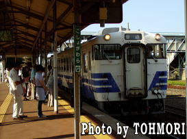 列車は奥羽線へ進み、ここは大釈迦。 下り普通列車との行き違いで停車です。 それにしても、天気が良くて陽射しが強いですねぇ。 列車内でも、冷房は入っているはずですが、温室のようになっていまして、ちょっと暑いくらいでした。 |